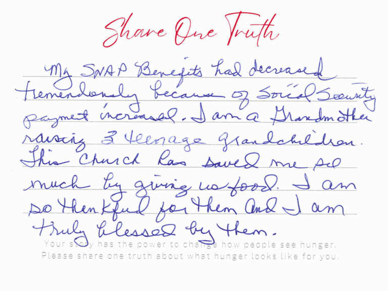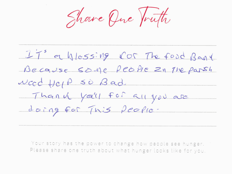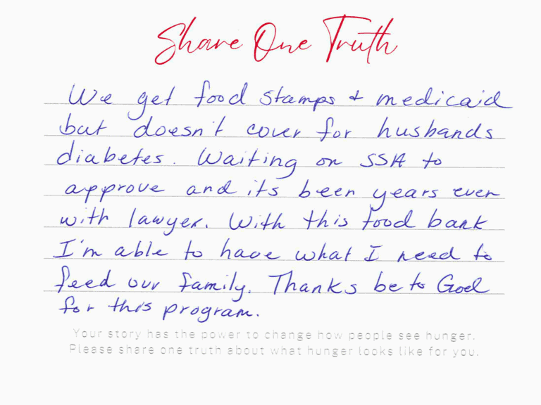 “I was [laid] off in 2023 for 1 [year], times [were] so hard, my husband was working. My son had a bad accident 41 [years] old I had to care for him. If it [wasn’t] for the Food Bank, we would not have any food [too]. I am so grateful. So bless for everything. Thank y’all so much.”