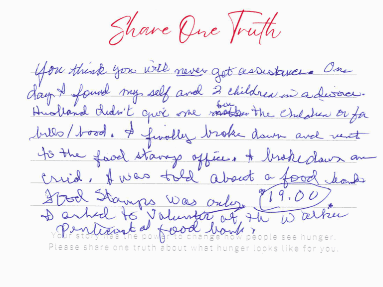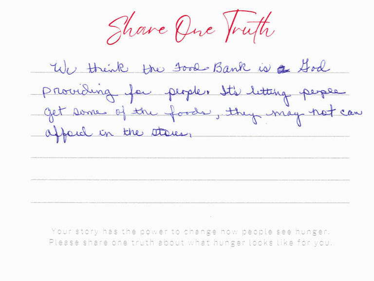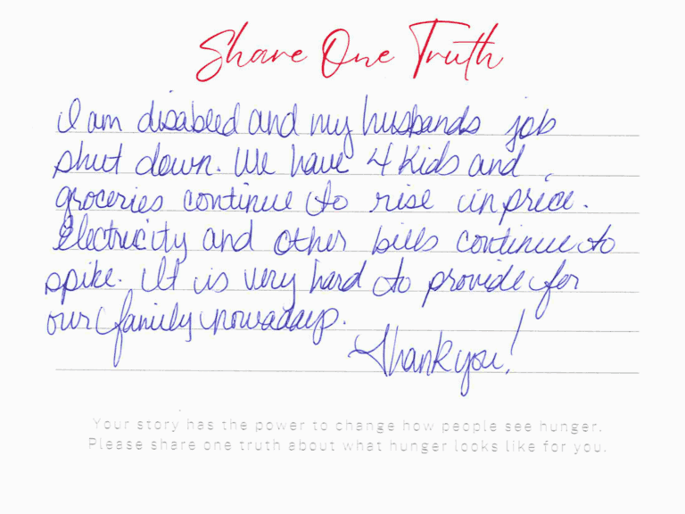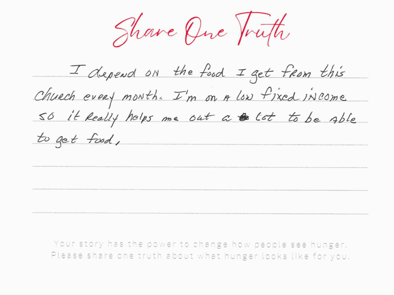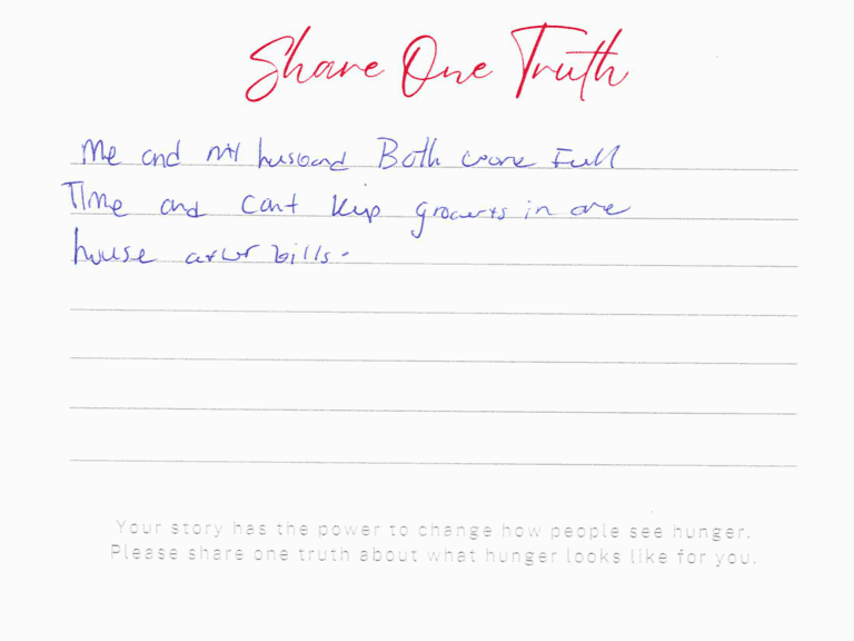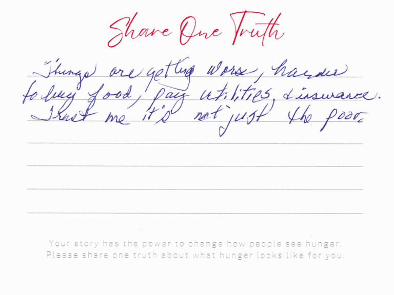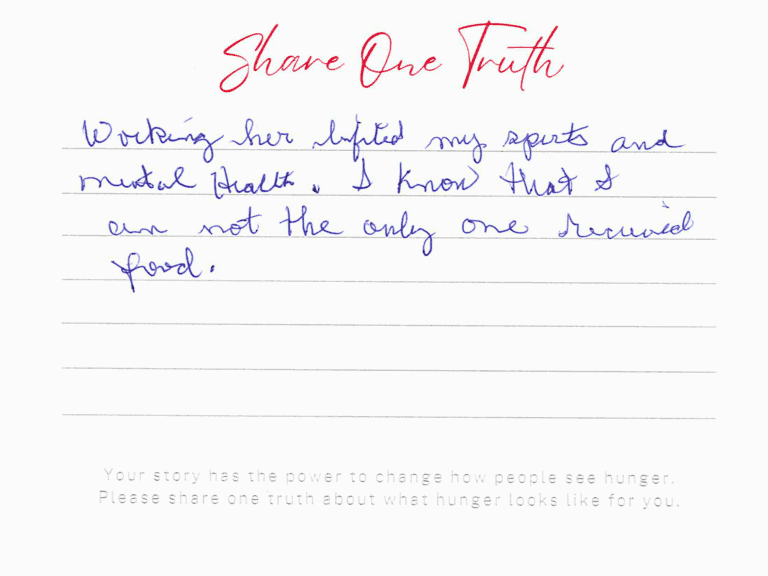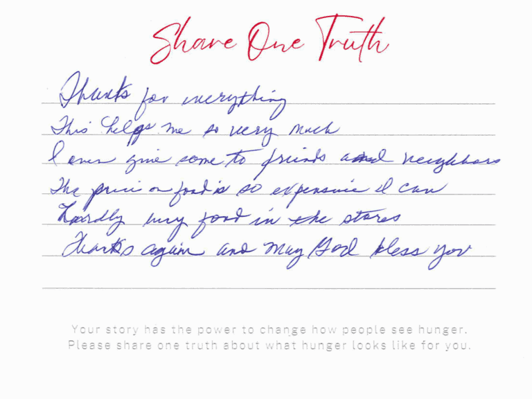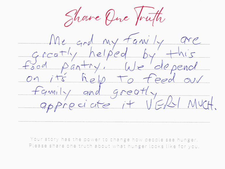 We invite you to read the real stories of hunger – shared anonymously, bravely and honestly by members of our community who experience it firsthand. These powerful messages remind us: hunger can look like anyone.