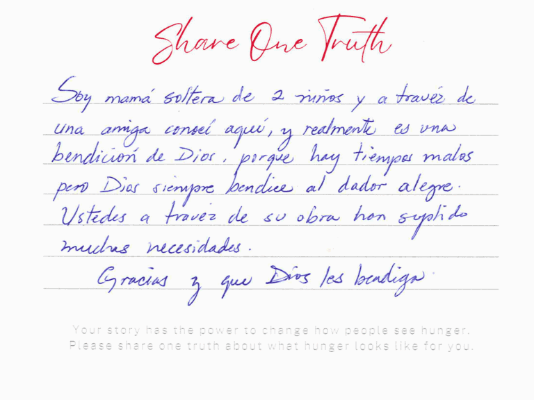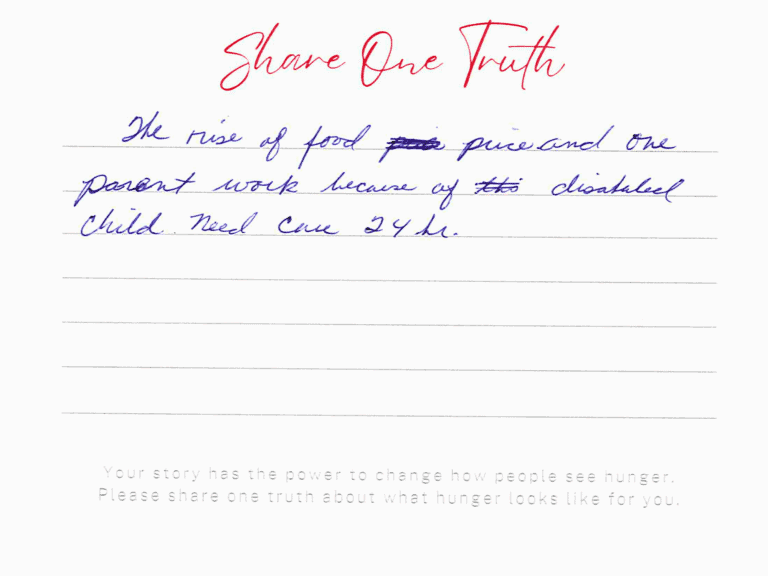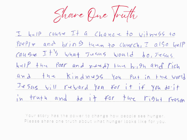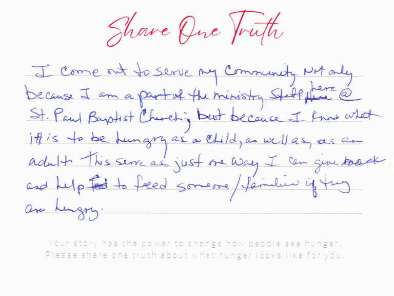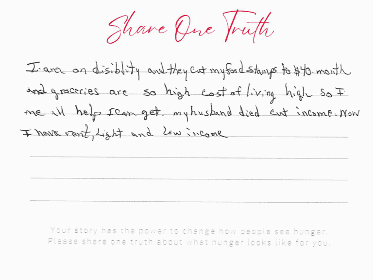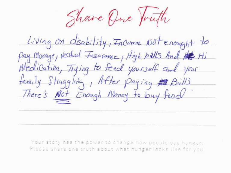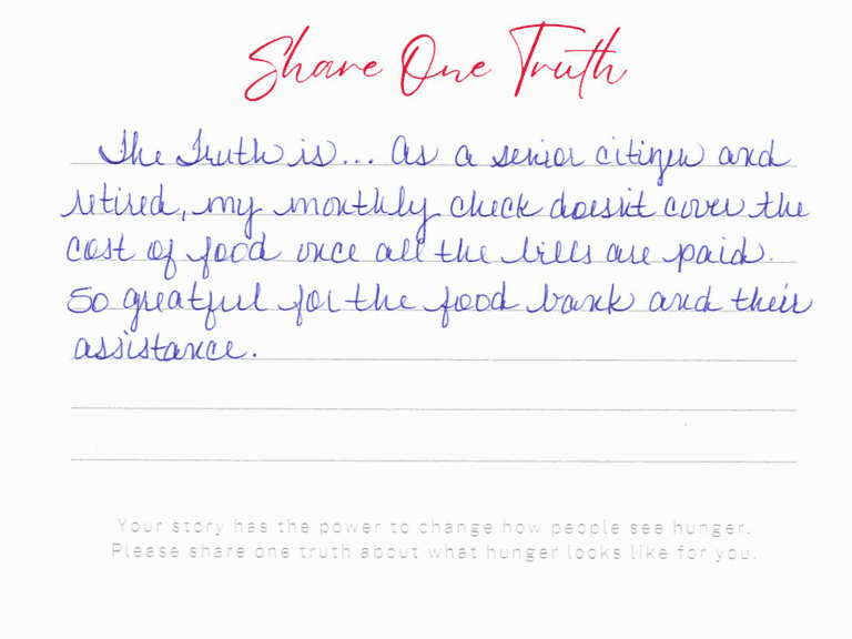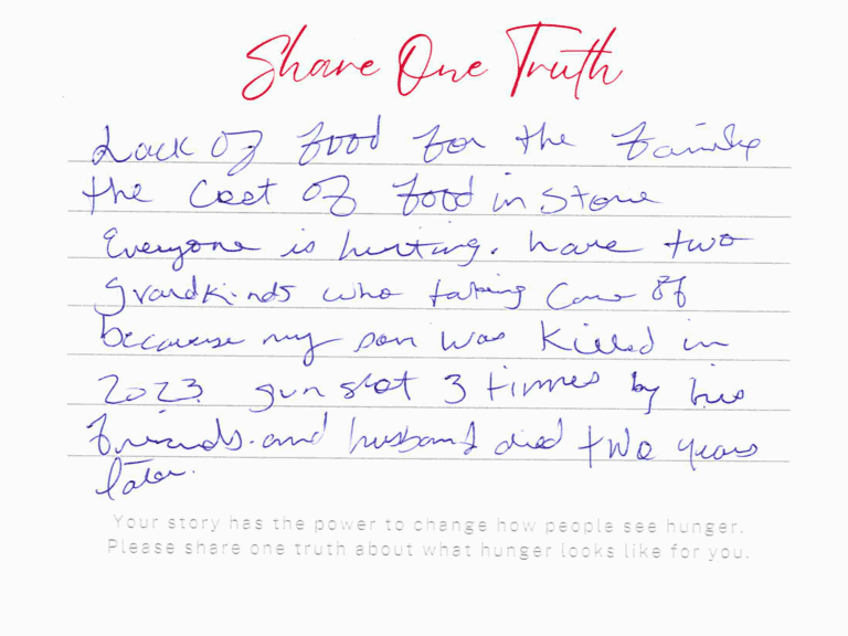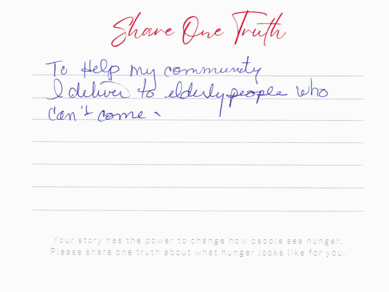 We invite you to read the real stories of hunger – shared anonymously, bravely and honestly by members of our community who experience it firsthand. These powerful messages remind us: hunger can look like anyone.