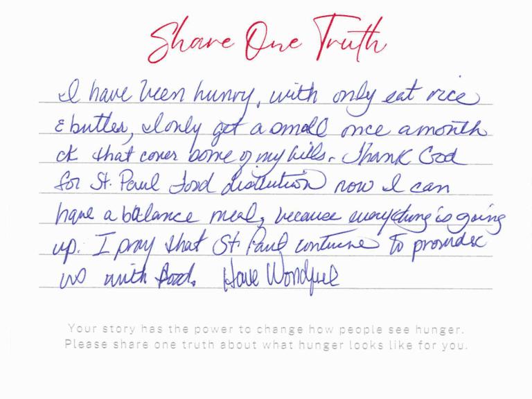 “I have been hungry, with only eat rice and butter, I only get a small once a month of that cover some of my bills. Thank God for St. Paul Food distribution now I can have a [balanced] meal, because everything is going up. I pray that St. Paul continues to provide us with food.”